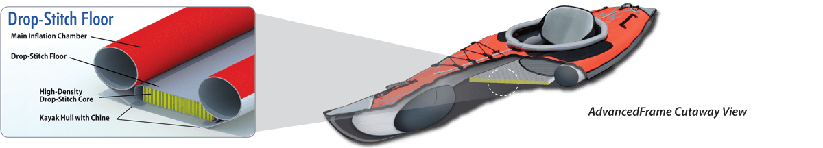 - Multi-layer bouw: in tegenstelling tot vele opblaasbare kajaks, waarin de zijwand van de belangrijkste kamer in feite de opblaaskamer zelf is, worden onze kajaks ontwikkeld met veelvoudige lagen van materiaal voor maximumduurzaamheid. De belangrijkste opblaaskamers worden omhuld in hun eigen buitenbuisdekking en worden de omhulde opblaaskamers dan beschermd door de buitenshell van het kajaklichaam die het beste in bescherming tegen de elementen aanbieden